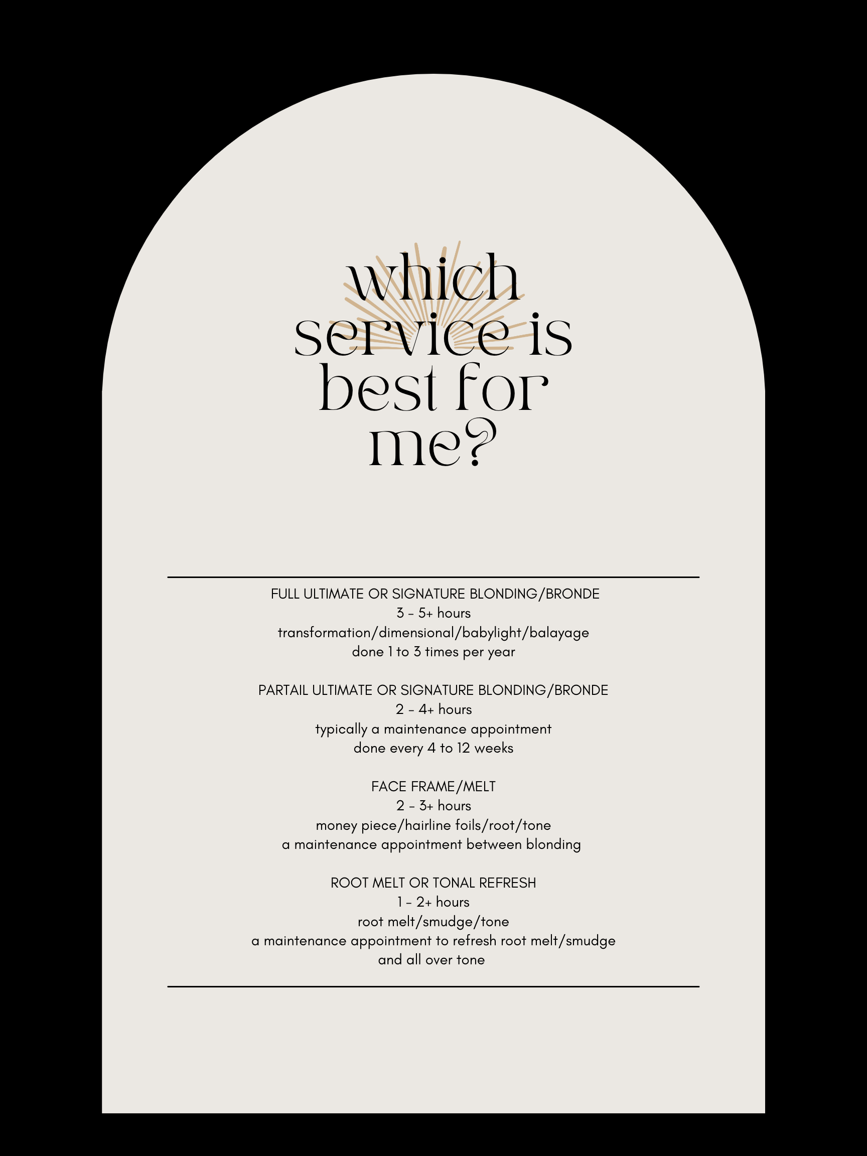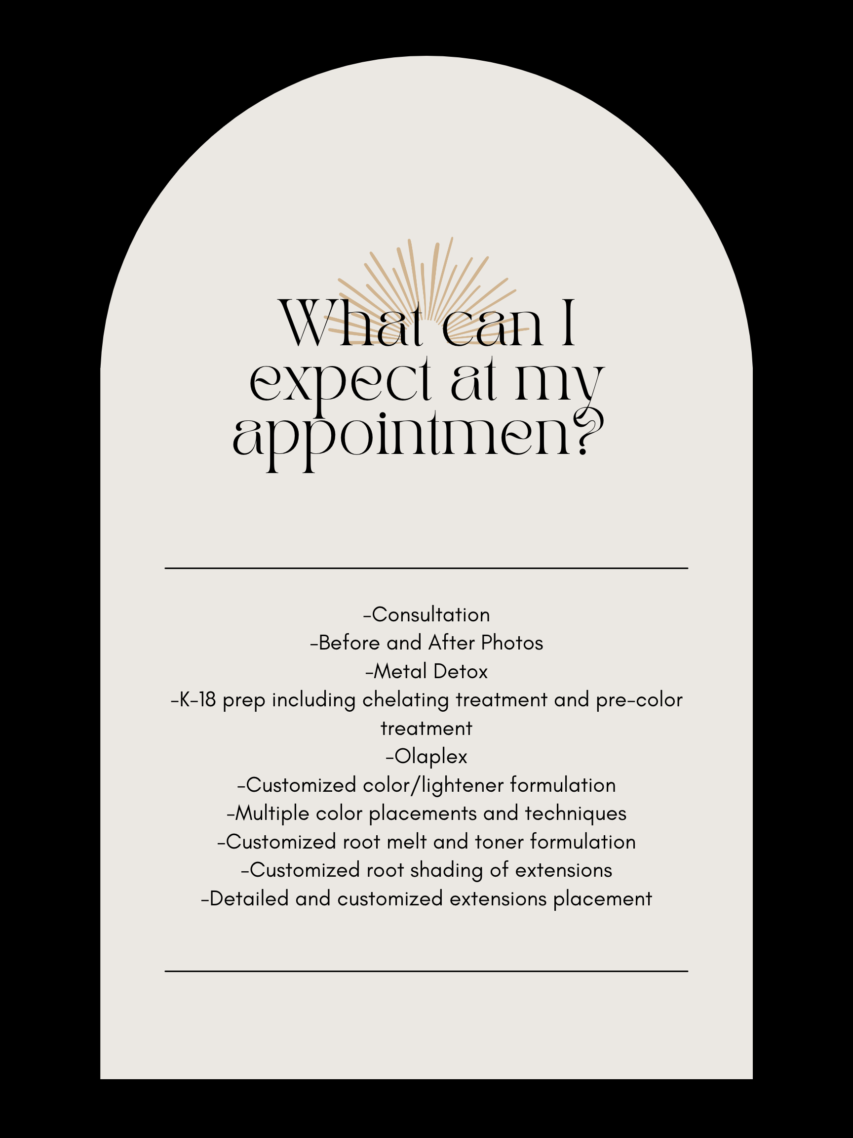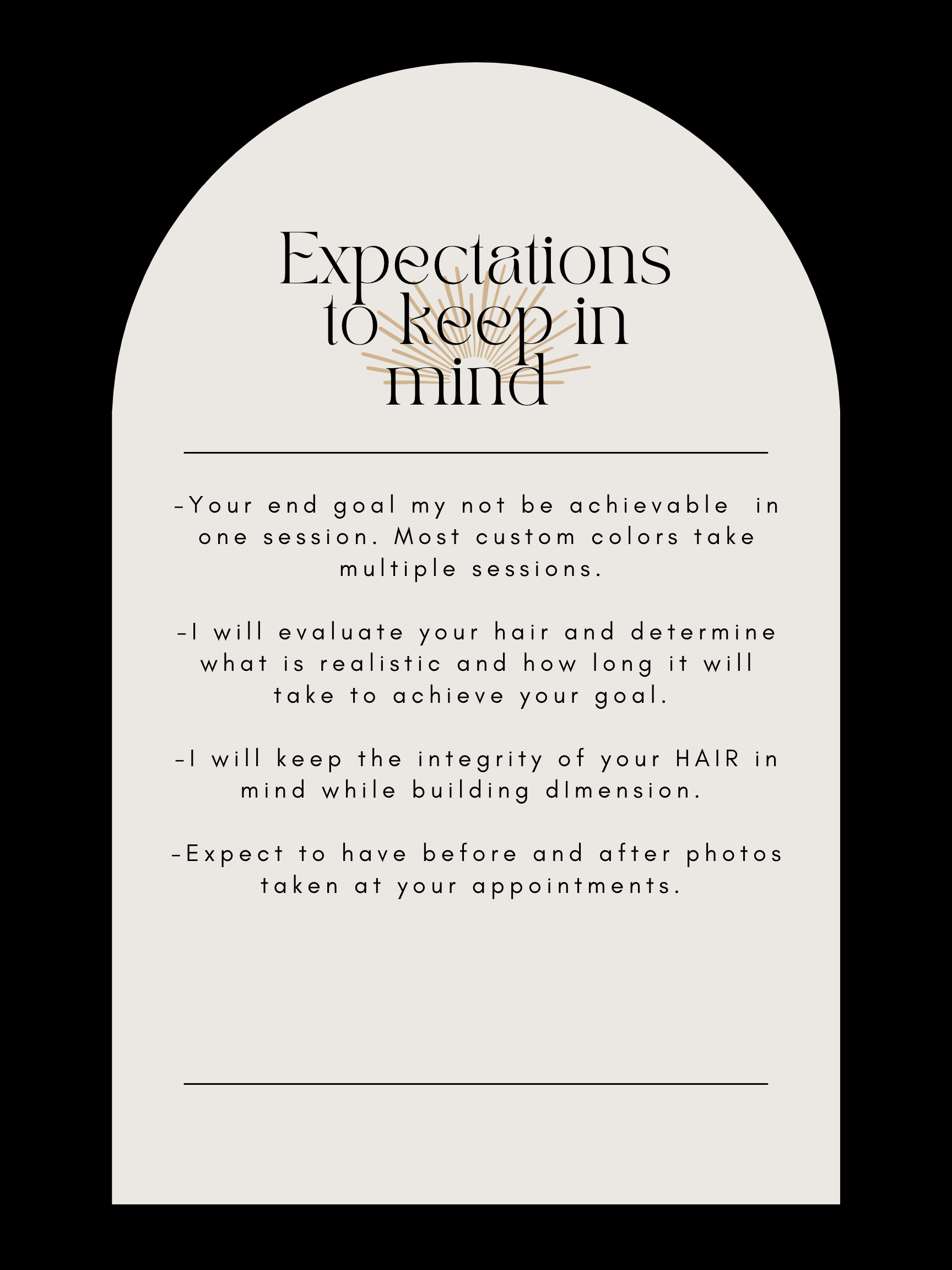 -YOUR END GOAL MY NOT BE ACHIEVABLE IN ONE SESSION. MOST CUSTOM COLORS TAKE MULTIPLE SESSIONS.